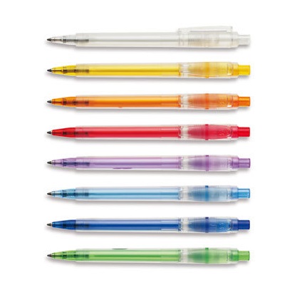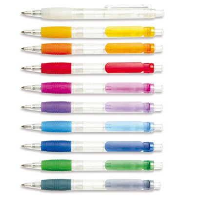 Mainoskynä huurrevalkoisella rungolla ja värillisellä kumigripillä ja klipsillä.